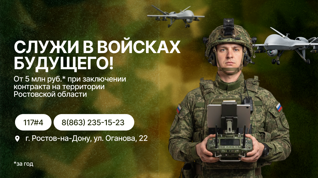 Найди призвание – заключи контракт! На Дону достойные денежные выплаты и социальные гарантии для военнослужащих: — 2,4 млн. рублей единовременно — от 210 тыс. рублей ежемесячно в зоне СВО — кредитные каникулы — 38 социальных гарантий — сохранение выплат 100% пенсий представителям силовых структур